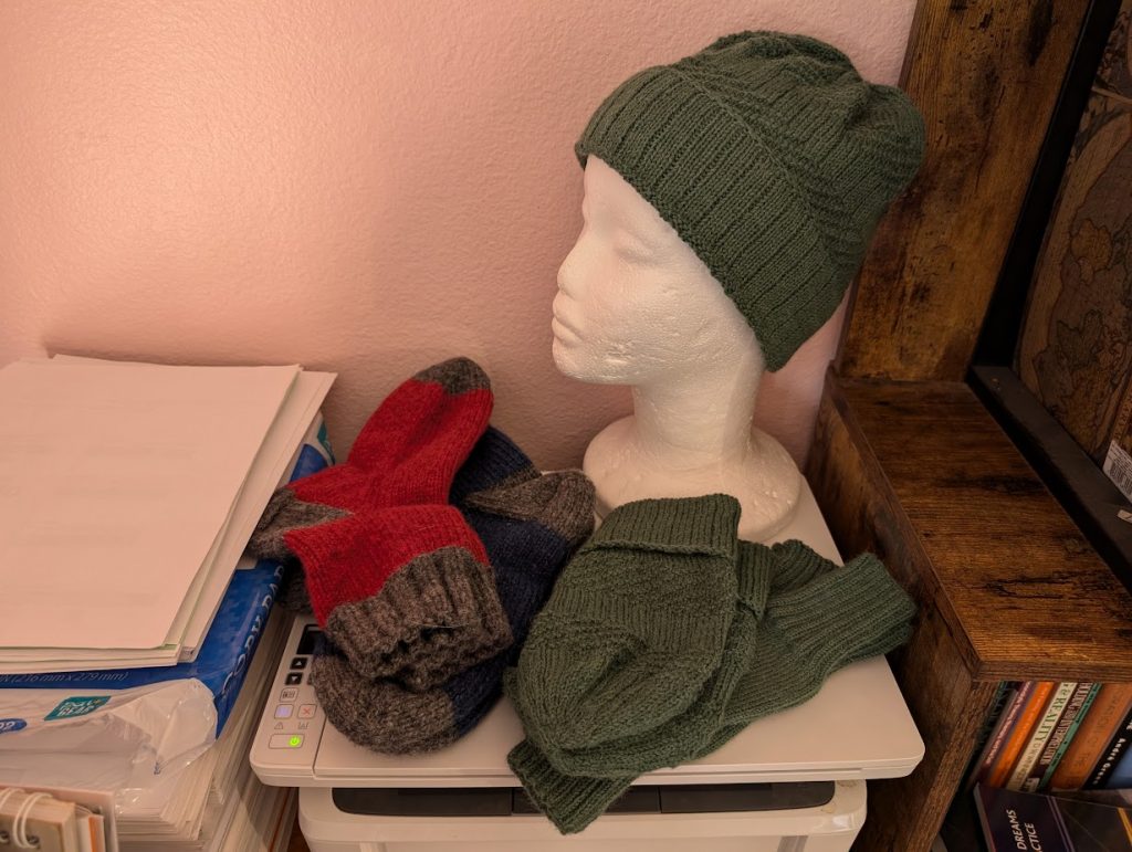 i am knitting and knitting and knitting ferociously, for the Ukrainian military. It feels a little bit like running a marathon while being uncertain at how i ended up participating in it. One finished project somehow sprouts into a few more, very much hydra-like. But some things do get finished and at least this project is done – a proud total of eight hats: