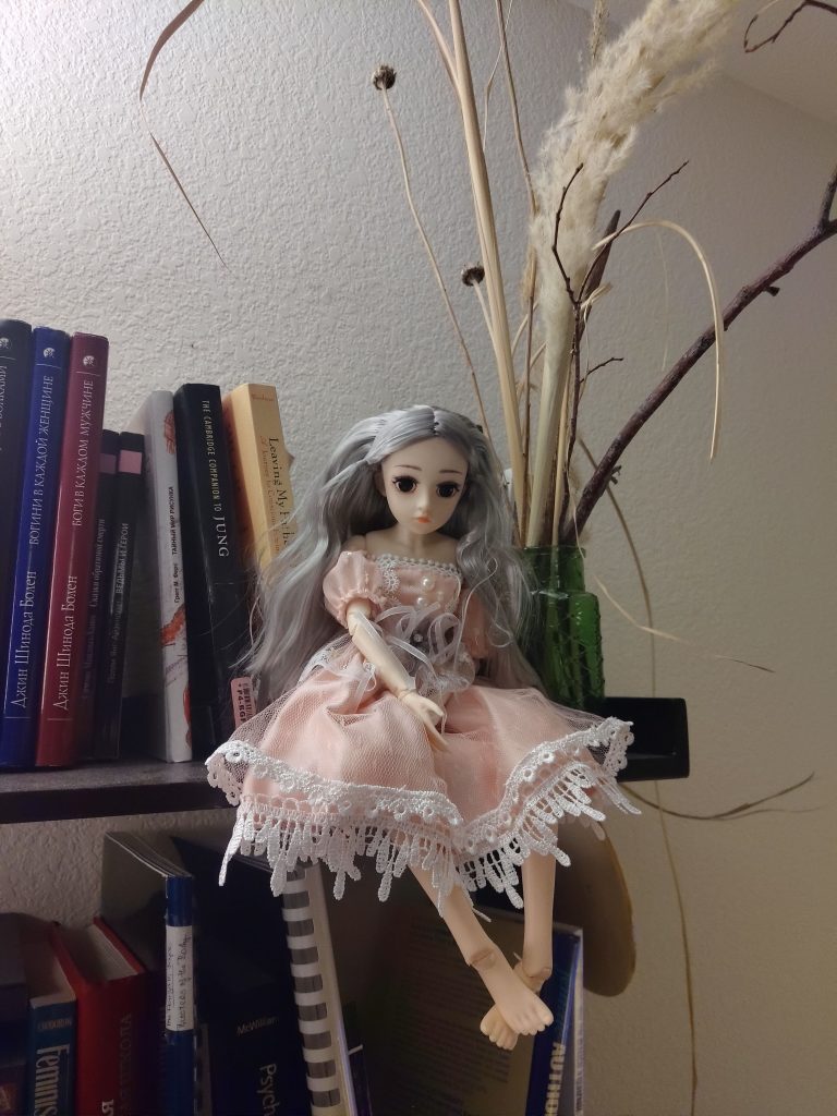 назву її Естер. Уже давно хотіла шарнірну ляльку. Кілька років мріяла про ляльку від мисткині Марини Бичкової. А тепер зрозуміла, що мені не стільки хочеться мати поруч із собою витвір мистецтва, як щось, що дозволить мені пробувати робити щось своє, хоч яким би простеньким воно не було. На день народження замовили були мені ляльку, але вона пристрягла на кордоні Китаю (не встигла вискочити до перекриття кордонів), і тепер невідомо коли приїде та й чи приїде взагалі. То поки купили цю малу. Якість не айс, але шарніри працюють (26 штук). Мені цього зараз досить.