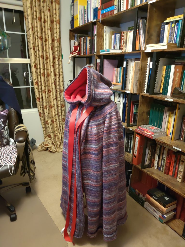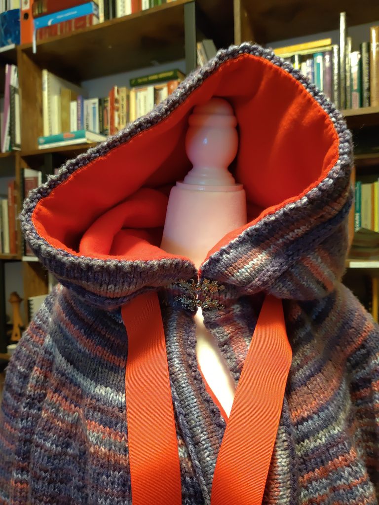 на це щастя у мене пішло 4 місяці життя. Плащ (якось дивно називати плащем плетену штуку, але якось інше слово не підбирається) майже на повний зріст дитини, 120 см, розкрил по пелені – майже три метри. Плетений із чистопородного американського акрилу (I Love This Yarn, 142 г х 230 м) спицями 4 мм. На загал акрил я не дуже люблю: шкідливий для довкілля, парний, рипить на спицях. Але цей виявився дуже приємним на доторк, м’яким і ніжним. Підбивка з флісу (цей принаймні начебто із вживаних пластикових пляшок роблять). Із нею довелося помучитися, і все одно вийшло із проблемами: не вийшло правильно обрахувати розширення по плечах, навіть із допомогою чоловіка. Тому дошивала (в останні два дні перед уродинами), аби вже дошити і щоб хоча б те, що зовсім видно, мало нормальний вигляд. От капюшон гарно вийшов, ним задоволена дуже.