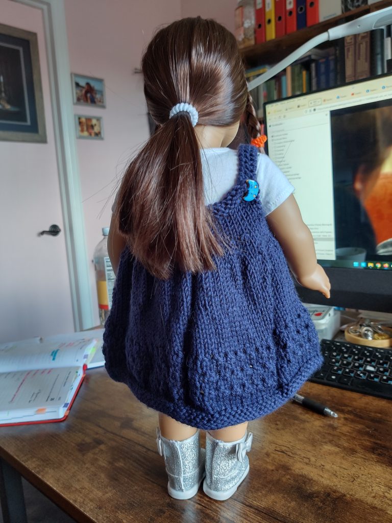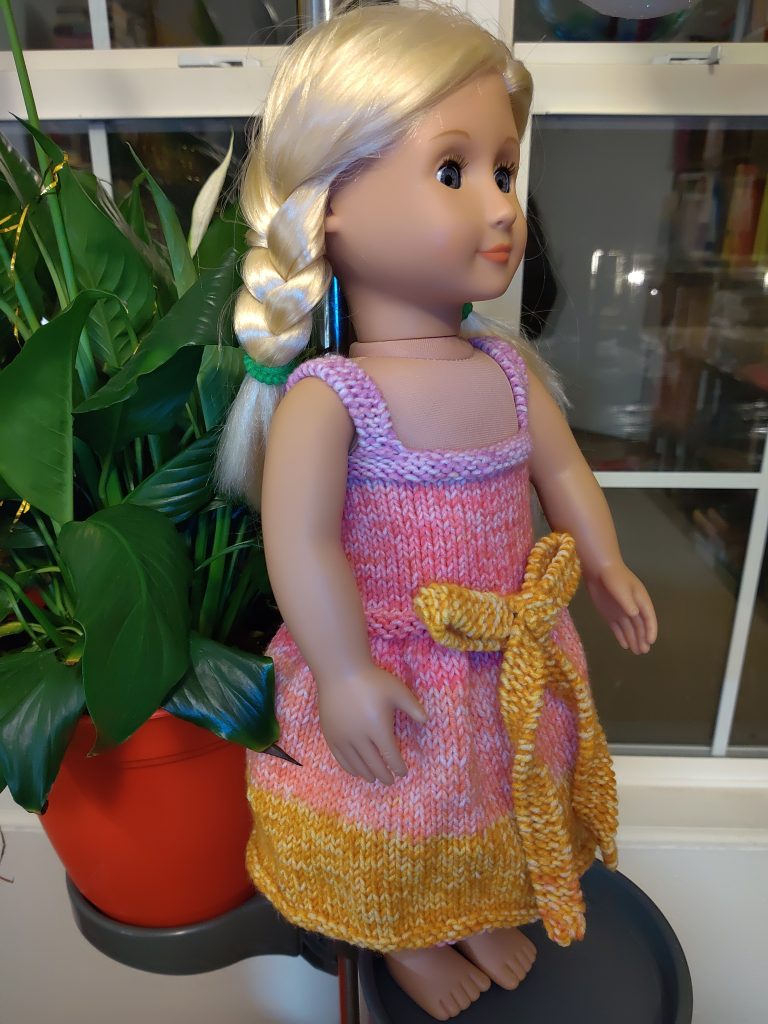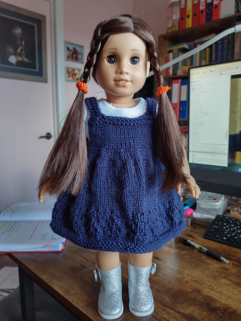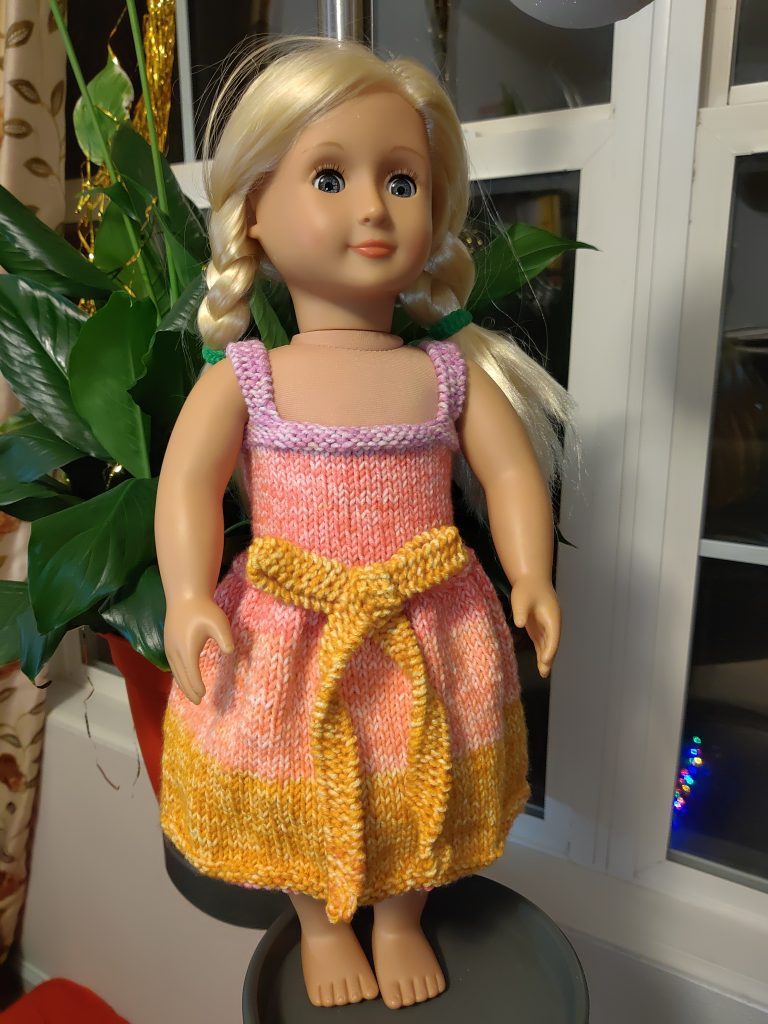 лялькам моїм цього року не дуже пощастило: у січні встигла сплести 1 літню сукню на 18-дюймову ляльку. У нашому домогосподарстві їх кілька, Ладі дуже подобалися. Спочатку, десь по приїзді сюди, купили бюджетну ляльку “Our Generation”. А згодом Лада назбирала грошей і купила собі American Girl – під індивідуальне замовлення (те, що тут називають індивідуальним: можна вибрати колір волосся та очей, поставити ластовинки – і це, вважай, усе). Улітку вона її усе-таки відклала – і я забрала її собі, бо щось шкода стало (Лада намагалася зробити її схожою на себе) замість OG.