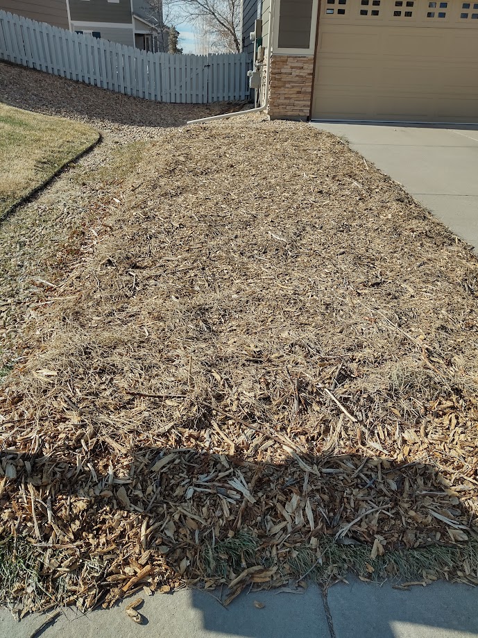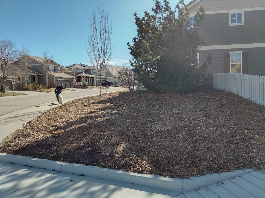 минулого року сухі плями уже були значно більшими, але ресурси (у тому числі й водні) на траву витрачати зовсім не хочеться. Цього року усе перегниватиме, а наступної весни підсипатимемо землю та висаджуватимемо ендеміки. Зараз, може, туди вкину місцеві соняхи – вони живуть і в гірших умовах зазвичай та практично не потребують поливу, – аби трохи розбавити мульчевий пейзаж.