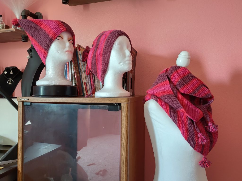 пряжа – Loops & Threads, Cosy Wool Merino (колір – USCZ04; 55% – супервош меріно, 45% антипілінговий акрил; 312 м х 125 г; делікатне прання, можна сушити у сушарці). Спиці – 4 мм. На бактус (187 см х 45 см у найширшій частині; хусткове плетіння) пішло 2+ мітки, а залишків від третього вистачило на обидві шапки.