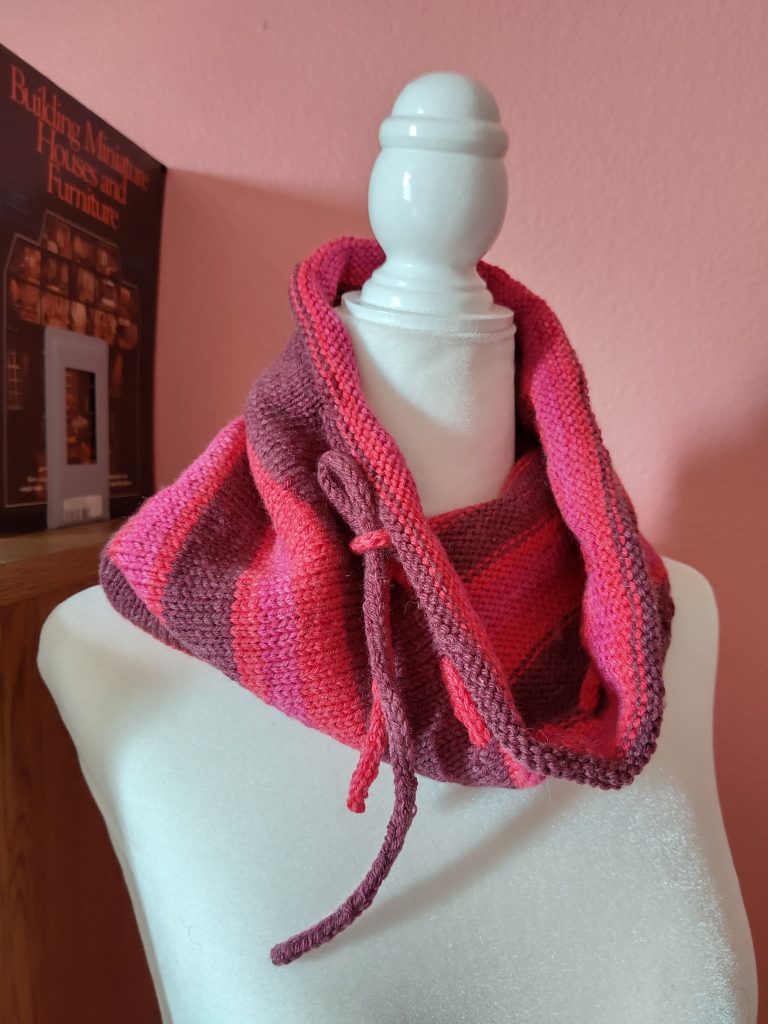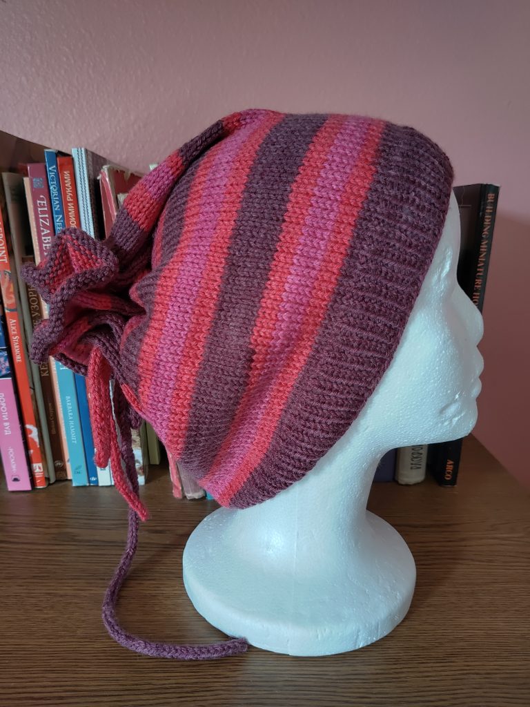 і вже зовсім із рештків – шапка-коул “Neck Warmer hat” із книжки “Interweave Presents. Knitted Gifts. Irresistible projects to make and give”. В одну нитку, спиці – 4 мм (10 см = 23 вічка панчішним плетінням). Шнурок – i-cord (анінайменшого уявлення, як це українською).