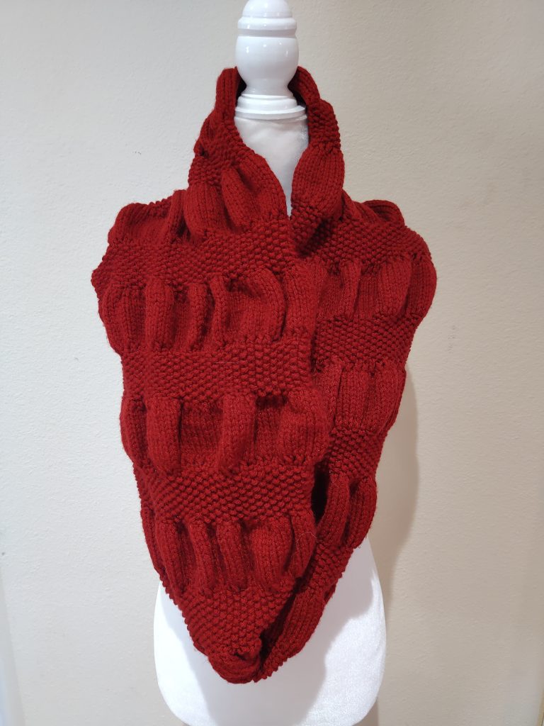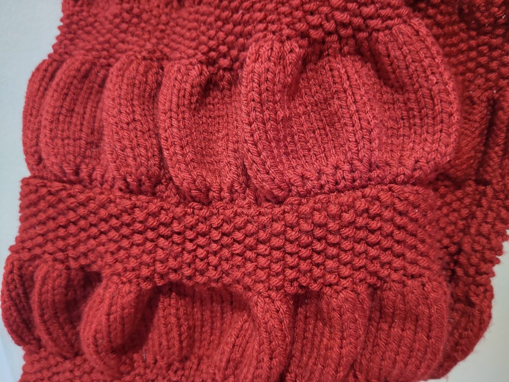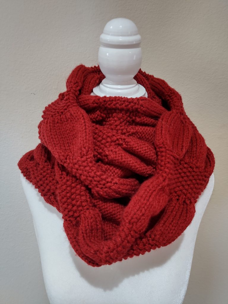 схема – Gather ‘Round Cowl із книжки “60 quick cowls. Luxurious projects to knit…”, написаною під пряжу Cascade. У мене пряжа I love this yarn, 100% акрилу (200 г х 325 м). Шпиці 5 мм. 16.8 вічок на 10 см панчішним плетінням.  Два повних мітки.