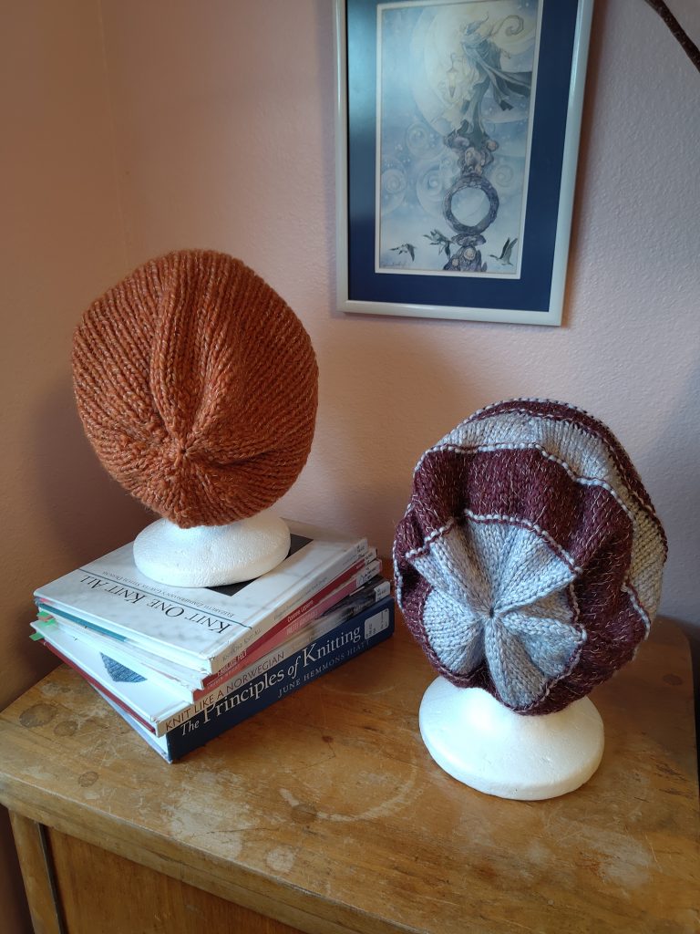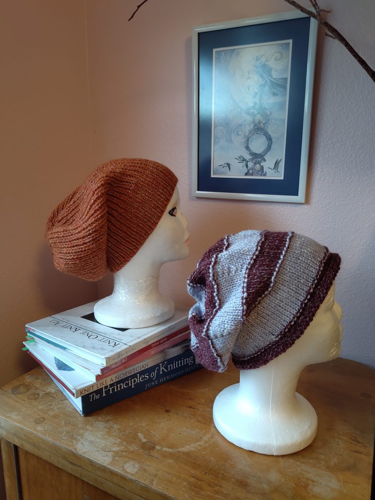 смугаста шапка – модель Greenwich із книжки D. Serviss “Knitted beanies and slouchy hats”. Руда – Rhubarb hat, із тої самої книжки.