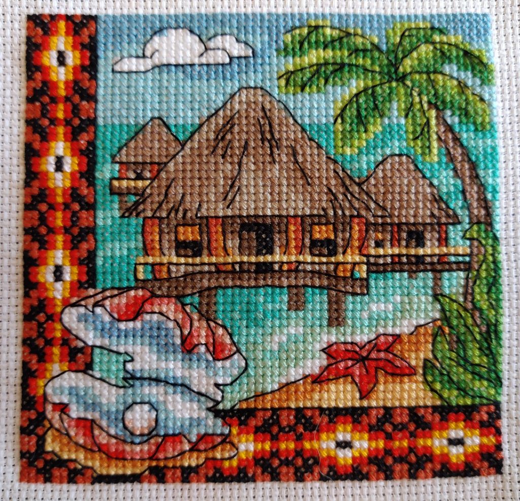у вівторок нарешті випрасувала вишивку, закінчену ще у лютому, – “Бунгало Океанії” Леді (серія “Мальовнича Україна” – не питайте, № 01280). На жаль, це був передостанній набір цієї фірми, залишився тільки “Російський теремок”, взятися за який важко через саму тільки назву.