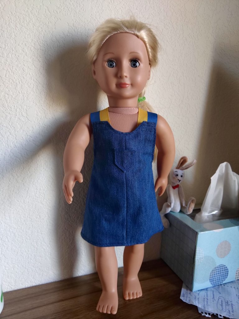 але сьогодні такий гарний день був, теплий, сонечко, настрій рівний, то майже весь день присвятила рукоділлю. Зранку посиділа над светром. А потім конфіскувала у чоловіка трансформатор (мій і досі не приїхав, уже й не знаю, якими волами він їде) – і сіла за джинсовий сарафан для доччиної ляльки Террі (Our Generation). Викройку зробила на тому тижні, а у неділю розкроїла, але на більше сил не стало. Мені дуже сподобалося, що вийшло: