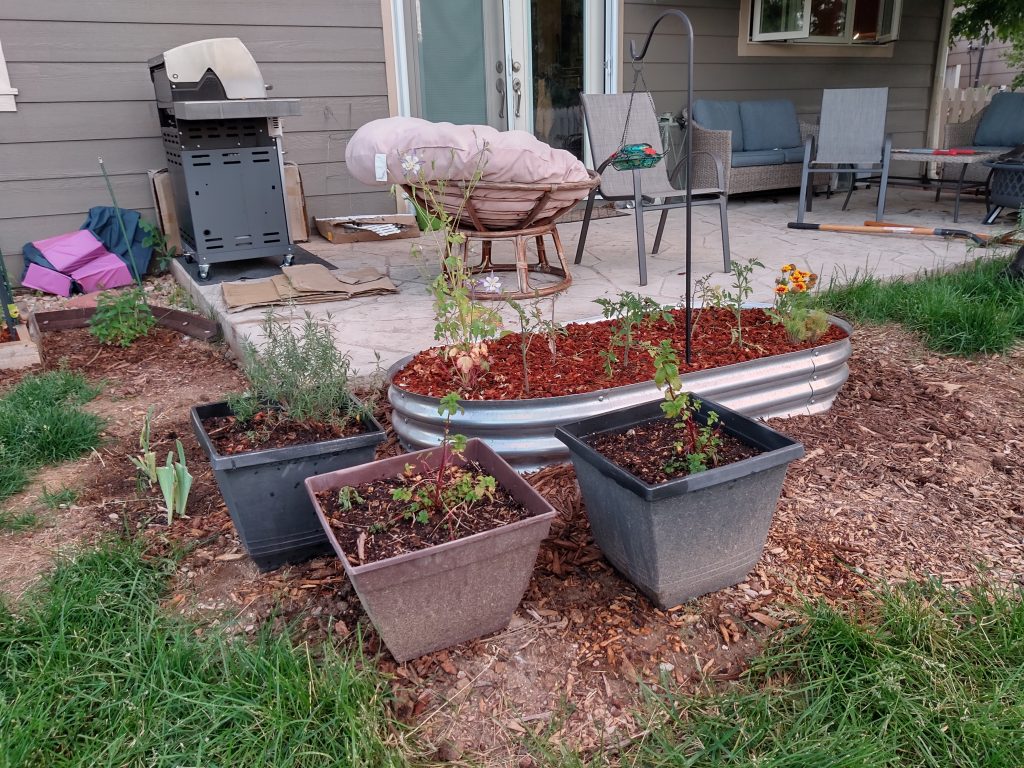 зате я повністю закінчила планувати клумби і грядки і висаджувати розсаджувати рослинки. Цього року ще не дуже добре видно через загальний бардак (спробую на цьому тижні прибрати, але навіть самій собі не обіцятиму, може, через тиждень-два приберу) та занехаяну траву, якою заросла навіть “кам’яна річка” (їх тут так і називають – stone rivers, а призначення їхнє – відводити воду, яка стікає з вищих частин ділянки або вище розташованих сусідів) – Гермес обіцяє її за літо потихеньку розчистити. Ну та й насадженим мною рослинкам треба кому прижитися та розростися, кому прийти до тями від п’ятьох тижнів злив і граду та перепаду на спеку, яка врубилася наступного дня після останнього дощу: +27-35 у тіні, майже зрання.
